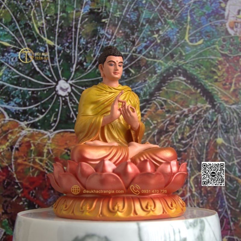 Tượng Bổn Sư chuyển pháp luân 15cm vàng cam là một pháp tượng mang ý nghĩa tâm linh sâu sắc, thể hiện khoảnh khắc Đức Phật Thích Ca Mâu Ni lần đầu tiên thuyết giảng giáo pháp tại vườn Lộc Uyển. Hình ảnh chuyển pháp luân tượng trưng cho sự vận hành của chân lý, sự khai mở trí tuệ và con đường giác ngộ dành cho chúng sinh. Với kích thước nhỏ gọn 15cm cùng gam màu vàng cam trang nhã, tượng không chỉ phù hợp để thờ phụng tại gia mà còn là vật phẩm phong thủy mang giá trị tinh thần cao, giúp không gian thờ tự trở nên trang nghiêm, ấm áp và thanh tịnh.
