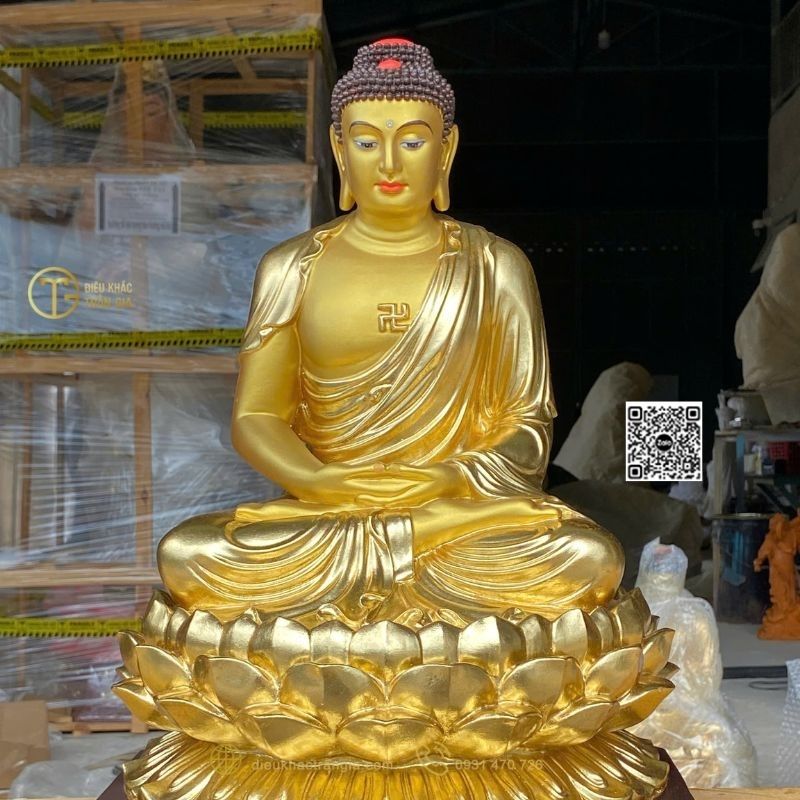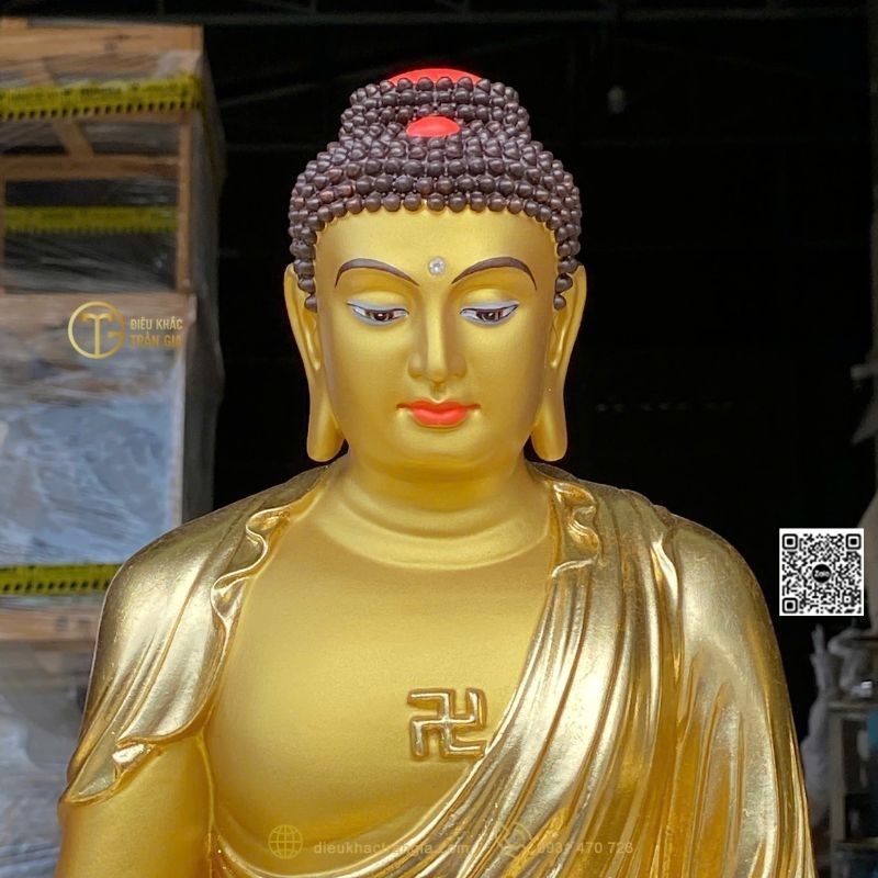 - Tượng khắc họa Đức Bổn Sư trong tư thế ngồi thiền kiết già, hai tay đặt ấn thiền định trang nghiêm, gương mặt hiền từ, ánh mắt khép nhẹ biểu trưng cho sự giác ngộ và tĩnh lặng nội tâm.